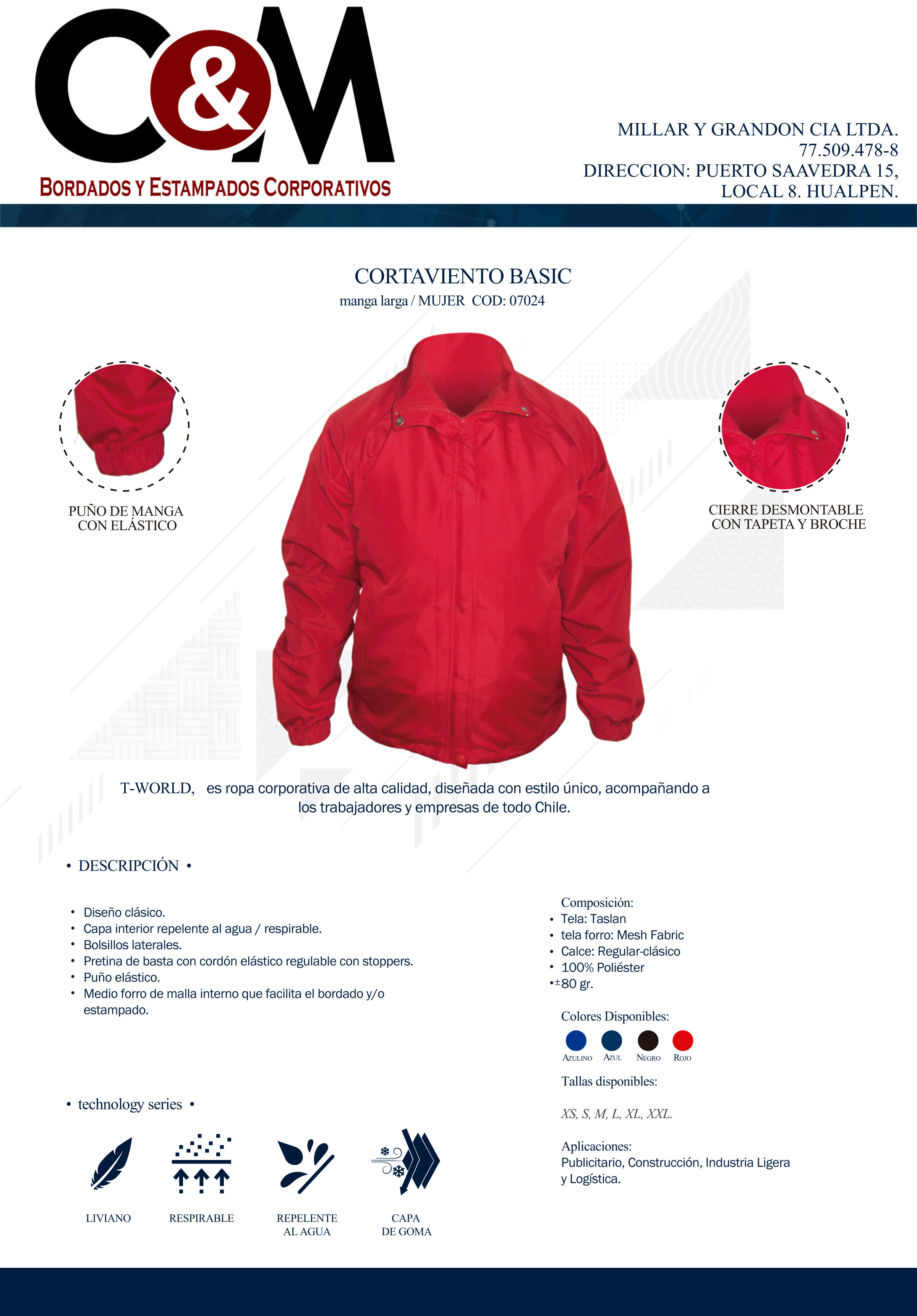 Cortaviento basic Mujer ligero y diseñado con un revestimiento de goma transparente PA al interior del tejido, para protegernos del aire y la lluvia suave, no está pensado para condiciones climáticas extremas. Cuenta con calce relajado que facilita el libre movimiento del cuerpo, posee mangas largas y pretina con cordón elasticidad regulable, para evitar la entrada de viento y mantener el calor corporal. Incluye medio forro de malla interno para facilitar el bordado o estampado.