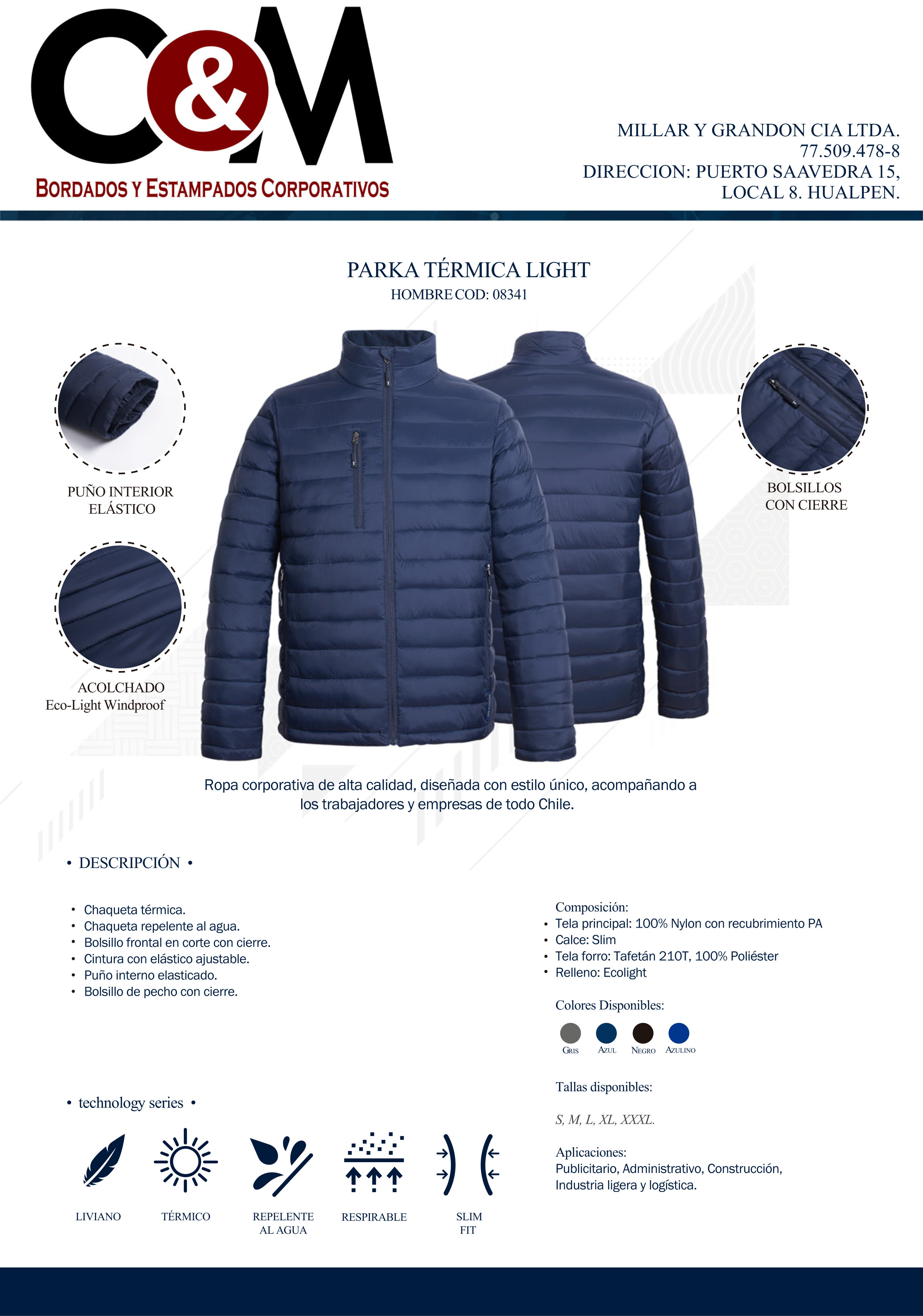 Parka térmica Light hombre, liviana y entallada, cuenta con relleno ecolight que proporciona un aislamiento superior incluso en condiciones húmedas; El tejido exterior es repelente al agua soportando una lluvia no muy intensa y por un periodo de tiempo no muy largo. Esta prenda incorpora recubrimiento PA que otorga una mayor resistencia al viento, además posee calce slim evitando el volumen innecesario de la prenda. Bolsillos frontales con cierre y bolsillos interiores de seguridad, perfectos para guardar objetos pequeños, además de contar con basta ajustable.
