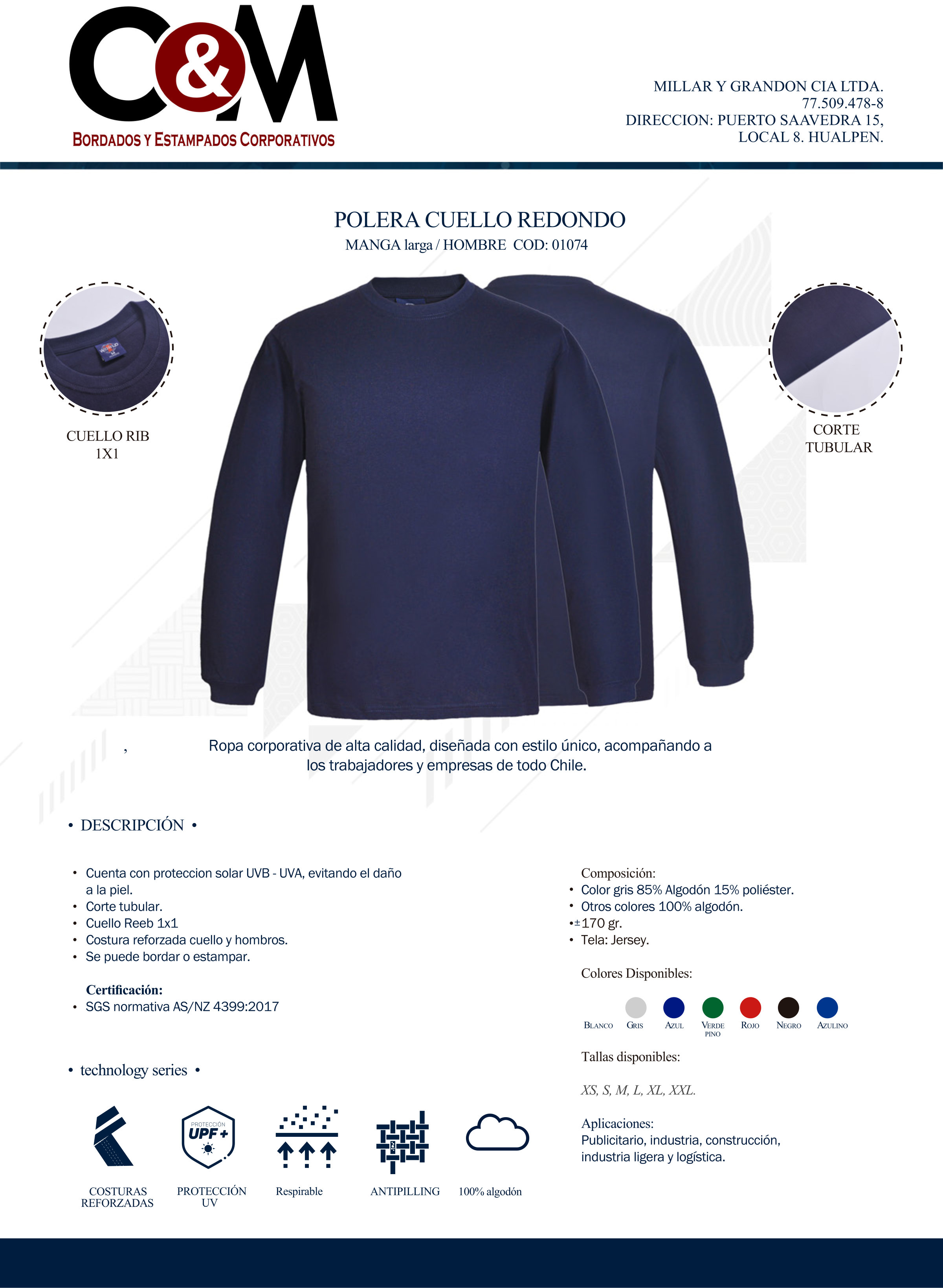 Polera manga larga con tejido 100% algodón que absorbe la humedad y permite que el aire fluya libremente, su diseño tubular sigue todos los movimientos de tu cuerpo entregando comodidad y versatilidad. Cuenta con costuras reforzadas en cuello y hombros otorgando seguridad en tus movimientos. Protege a tus trabajadores de la prolongada exposición a los rayos UV, por medio de la ley 20.096 que consiste en proteger eficazmente a los trabajadores de la radiación ultravioleta.