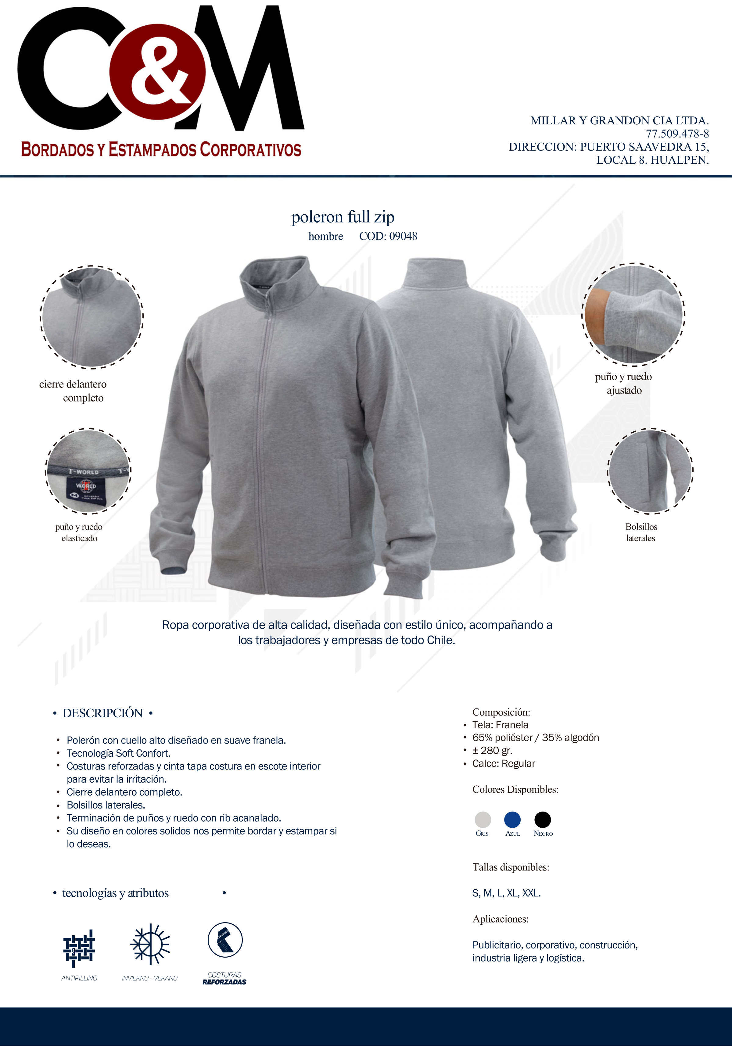 Polerón Full Zip unisex, fabricado en suave franela de excelente calidad, cuenta con tecnología Soft Comfort de bajo porcentaje de encogimiento además posee calce regular que entrega un look moderno y cómodo. Esta prenda cuenta con cierre completo y bolsillos en los costados convirtiéndola en un producto versátil. Las terminaciones de sus puños y ruedo son de forma rib acanalado, posee costuras reforzadas y cinta tapa costura en escote interior para evitar el roce. Su diseño minimalista en colores sólidos nos permite bordar y estampar si lo desea.